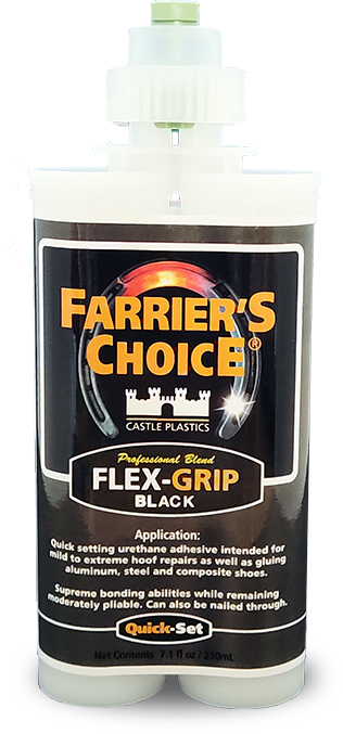 Quick-setting urethane adhesive intended for mild to extreme hoof repairs as well as gluing aluminum, steel and composite shoes.