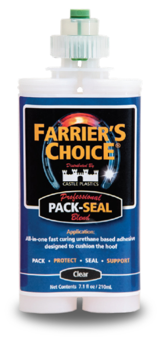 Farrier's Choice Professional Pack-Seal Blend is an All-in-one fast curing urethane based adhesive designed to cushion the hoof, that cures soft and stay soft.